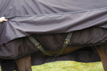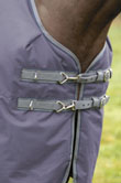 This Deluxe turnout is made of 1680D Poly Nylon outer with Teflon coating, it has a built in under rug that is contructed from a nylon lining with a 300g filling. This turnout is fully waterproof and breathable. The Deluxe turnout has hidden cross surcingle straps to elimate stitching on the outer waterproof fabric. This rug has been cut to prevent rubbing to the shoulders and to provide a snug fit to the quarters. Other features to the rug include adjustable and removeable leg straps, large gusseted tail flap adjustable double front buckles with quick release clips. A matching neck cover is available; this attaches in three places and has an anti-rub lining and fleece poll protection built in.